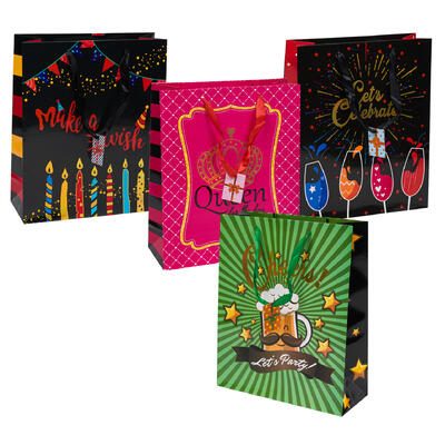 85715Flomo Happy Birthday Gift Bags - 10.5x13" - Celebrate & Party Design - 4 Assorted Colors - Recyclable